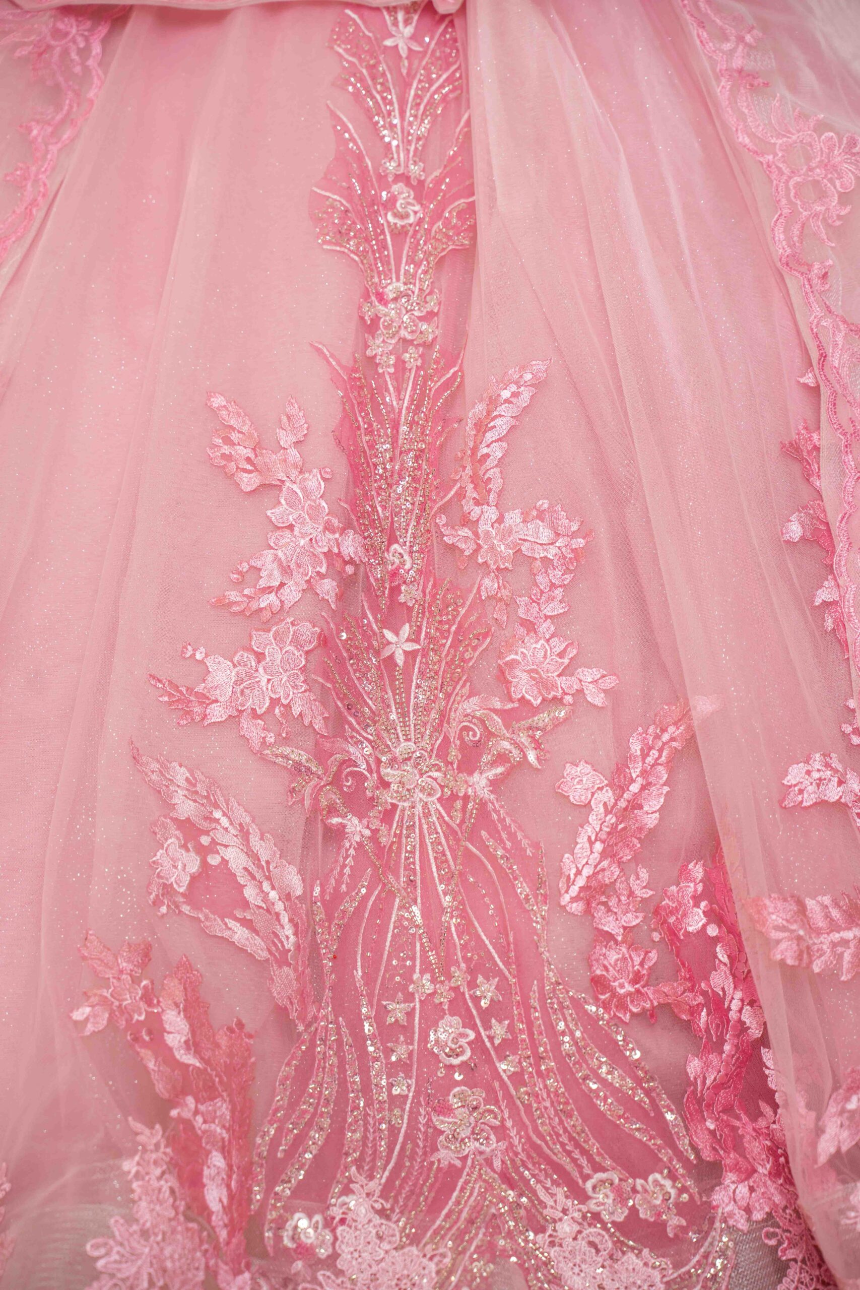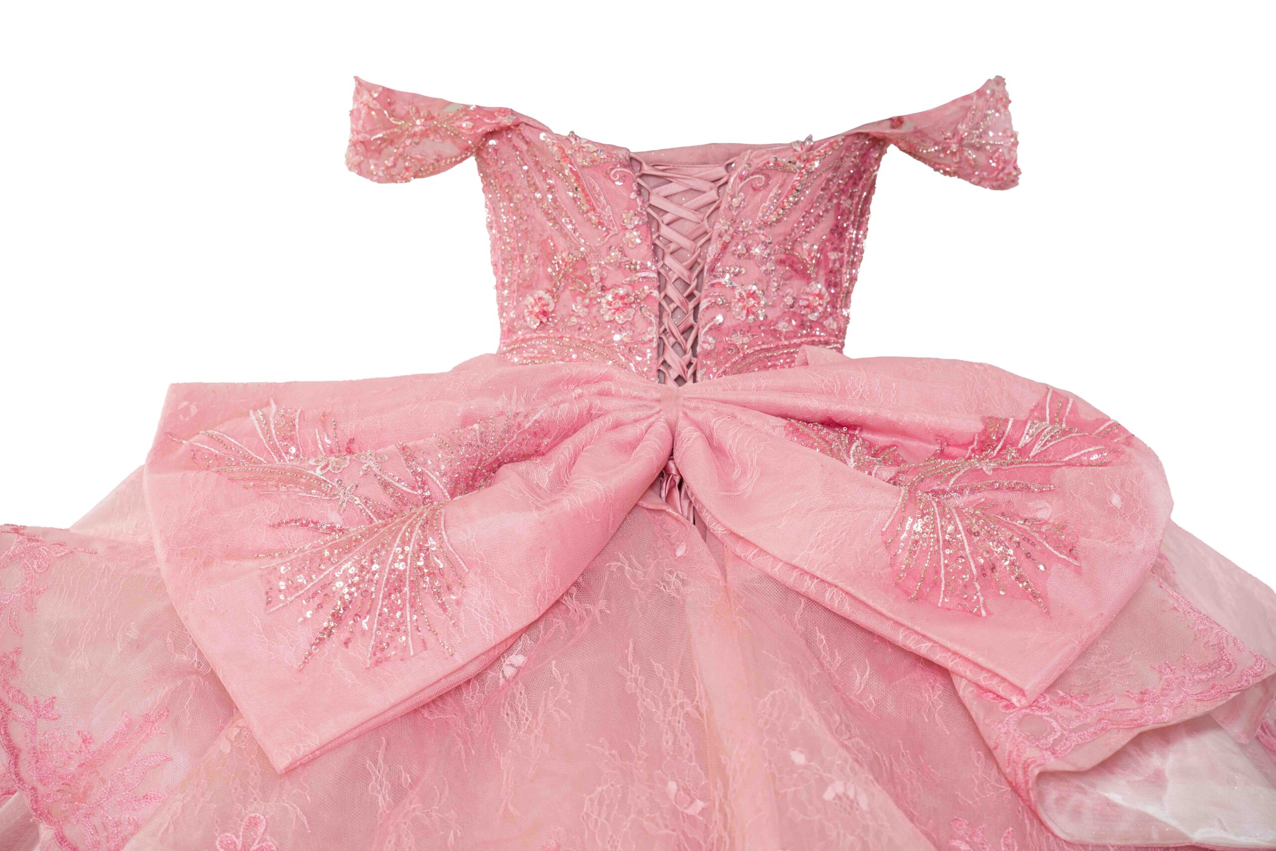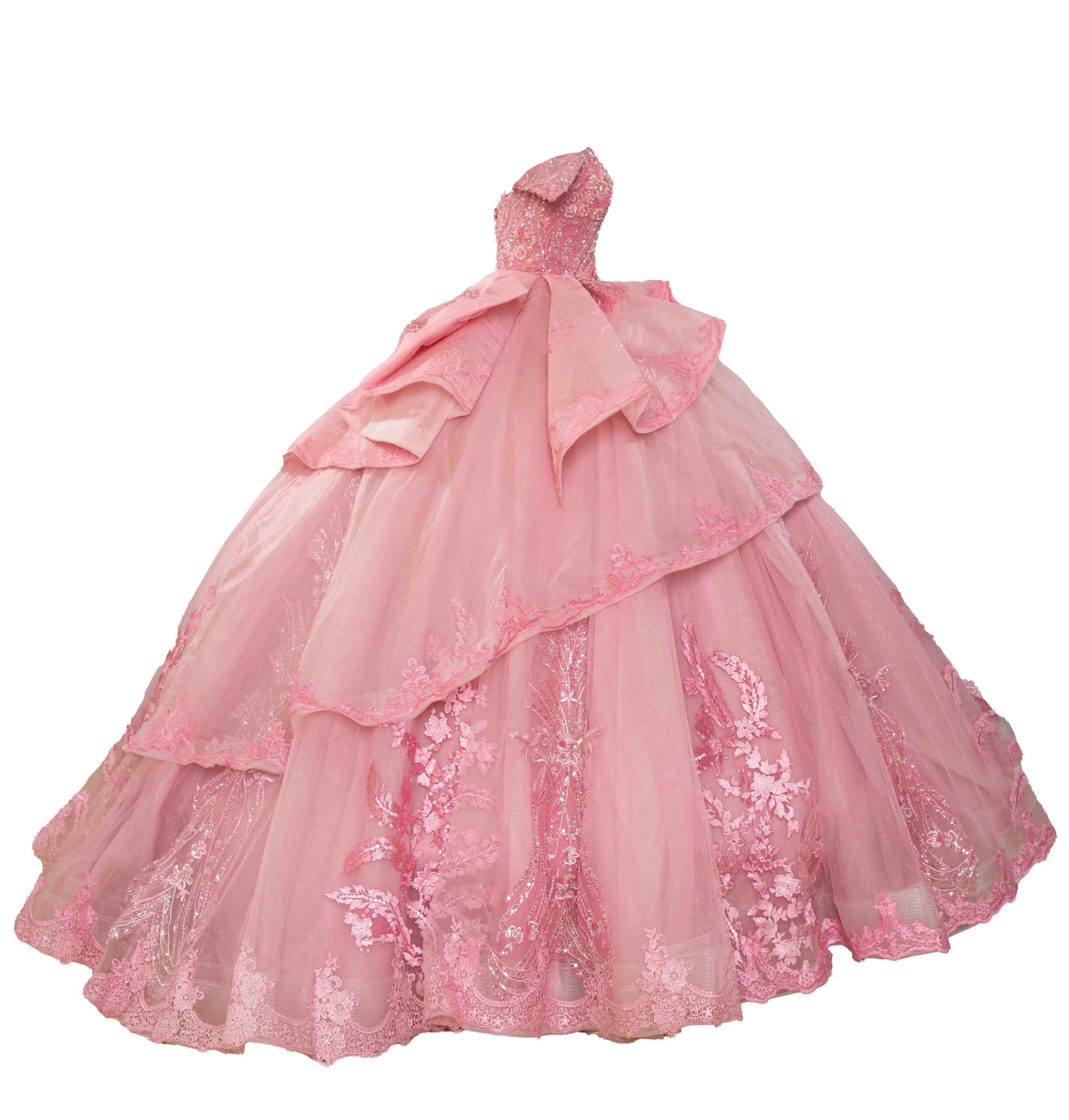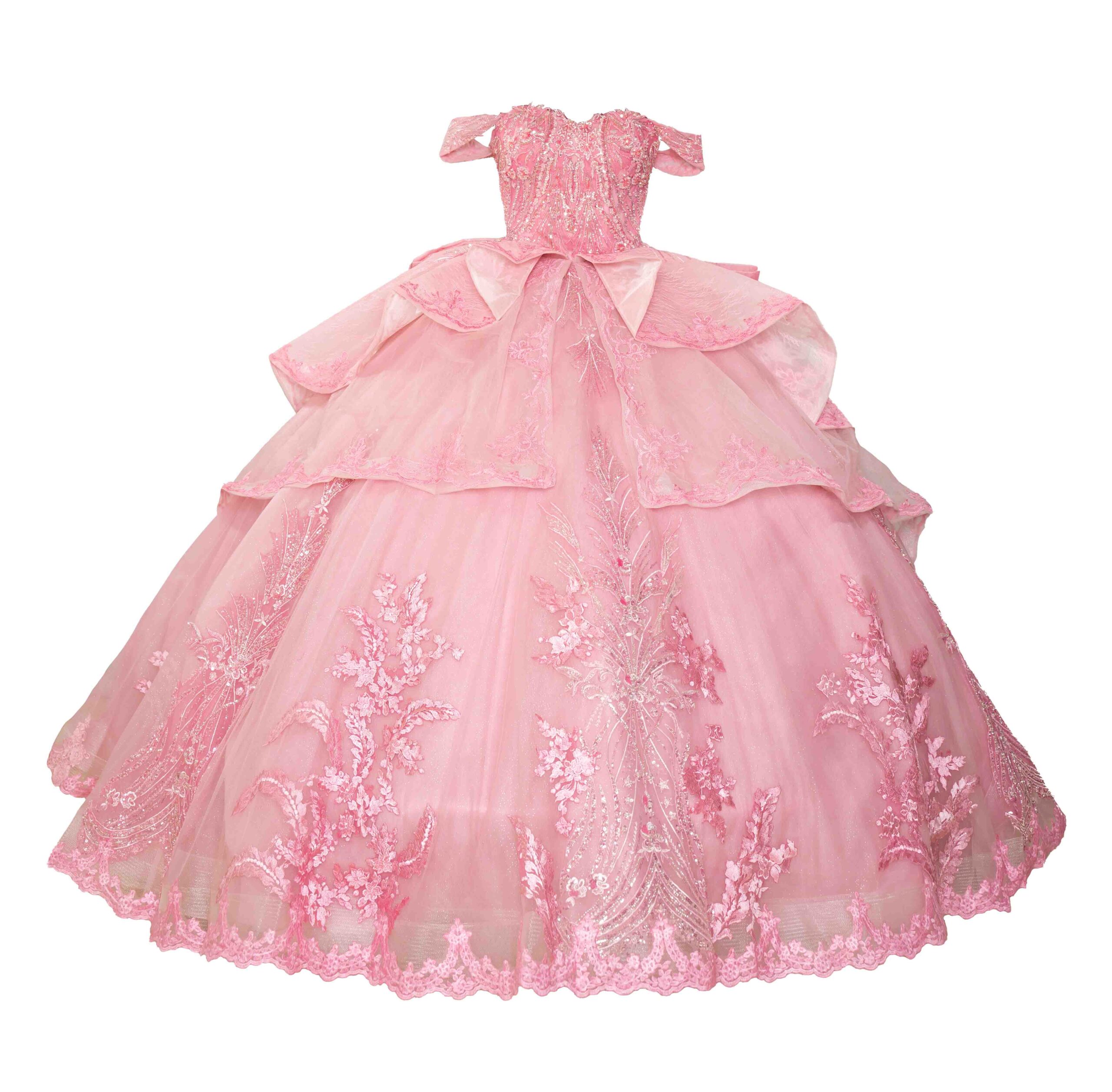 This exquisite pink dress is a masterpiece of feminine elegance, perfect for making a grand entrance at your Quinceañera. The bodice is intricately adorned with detailed embroidery, showcasing a delicate pattern that adds an element of sophistication. A graceful off-the-shoulder neckline accentuates the collarbone and shoulders, while the fitted waistline elegantly transitions into a voluminous skirt. Layers of luxurious tulle fabric cascade to the floor, each tier more enchanting with its ethereal floral embroidery. A large bow at the back adds a touch of whimsy, making this dress not just a piece of clothing but a work of art