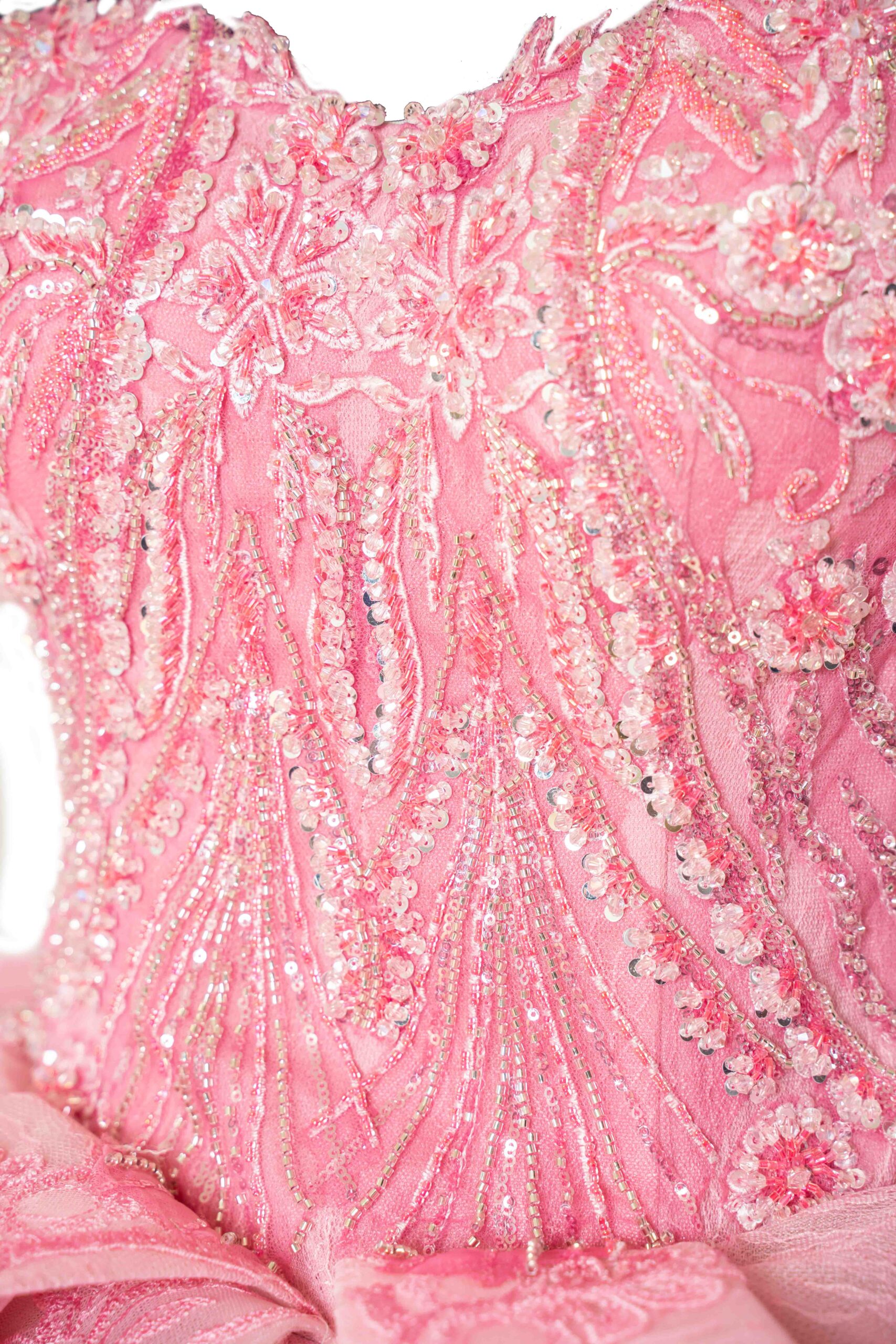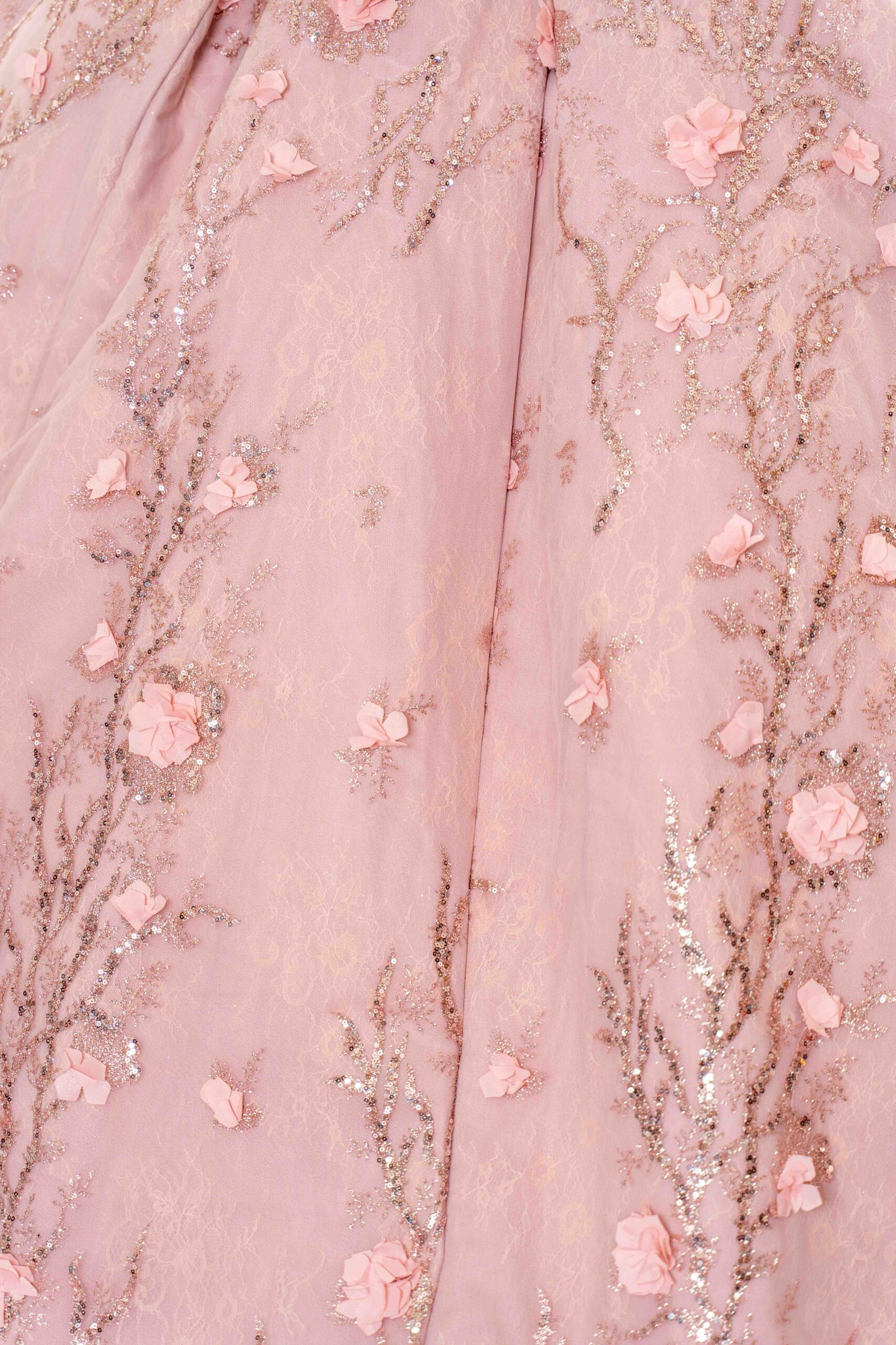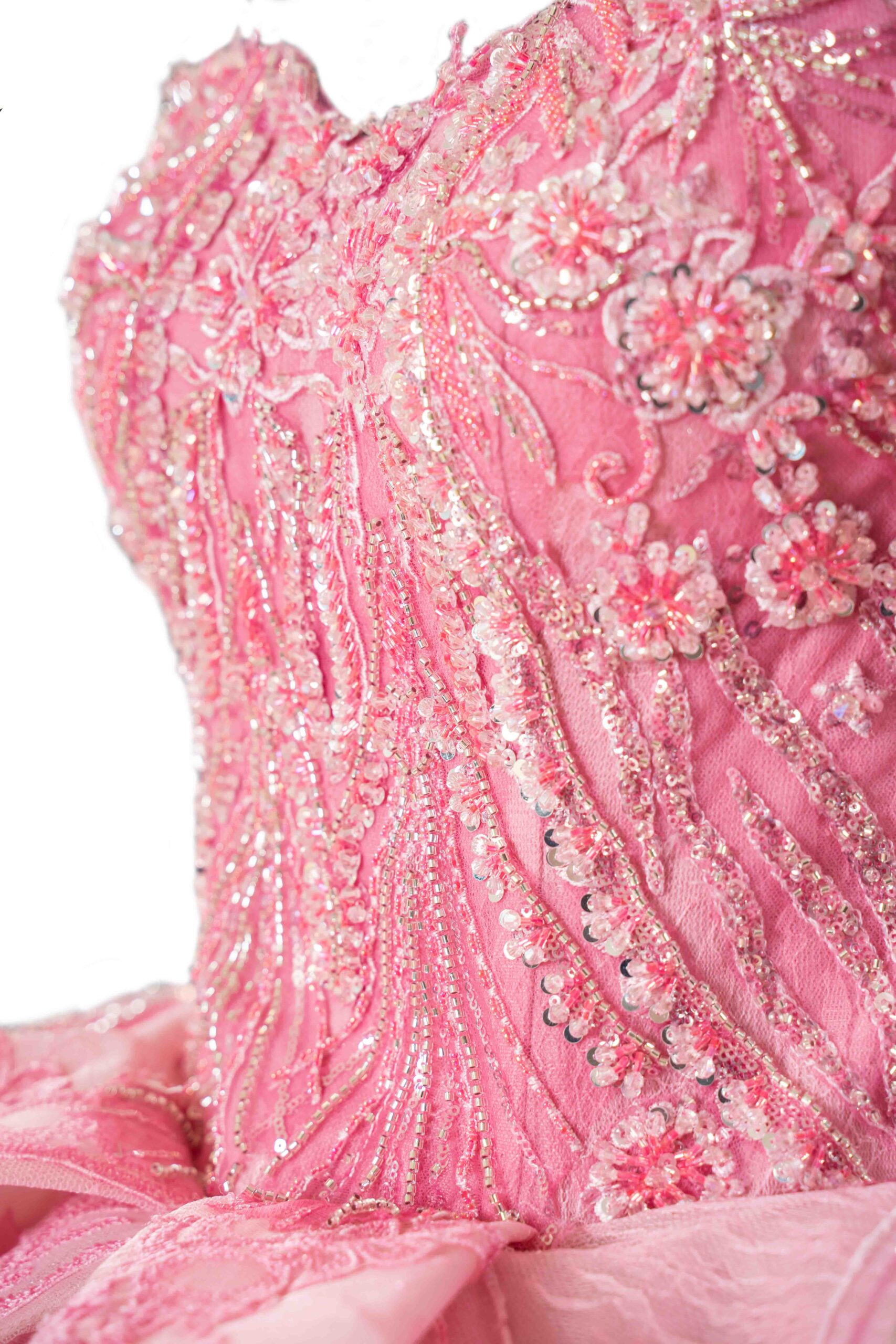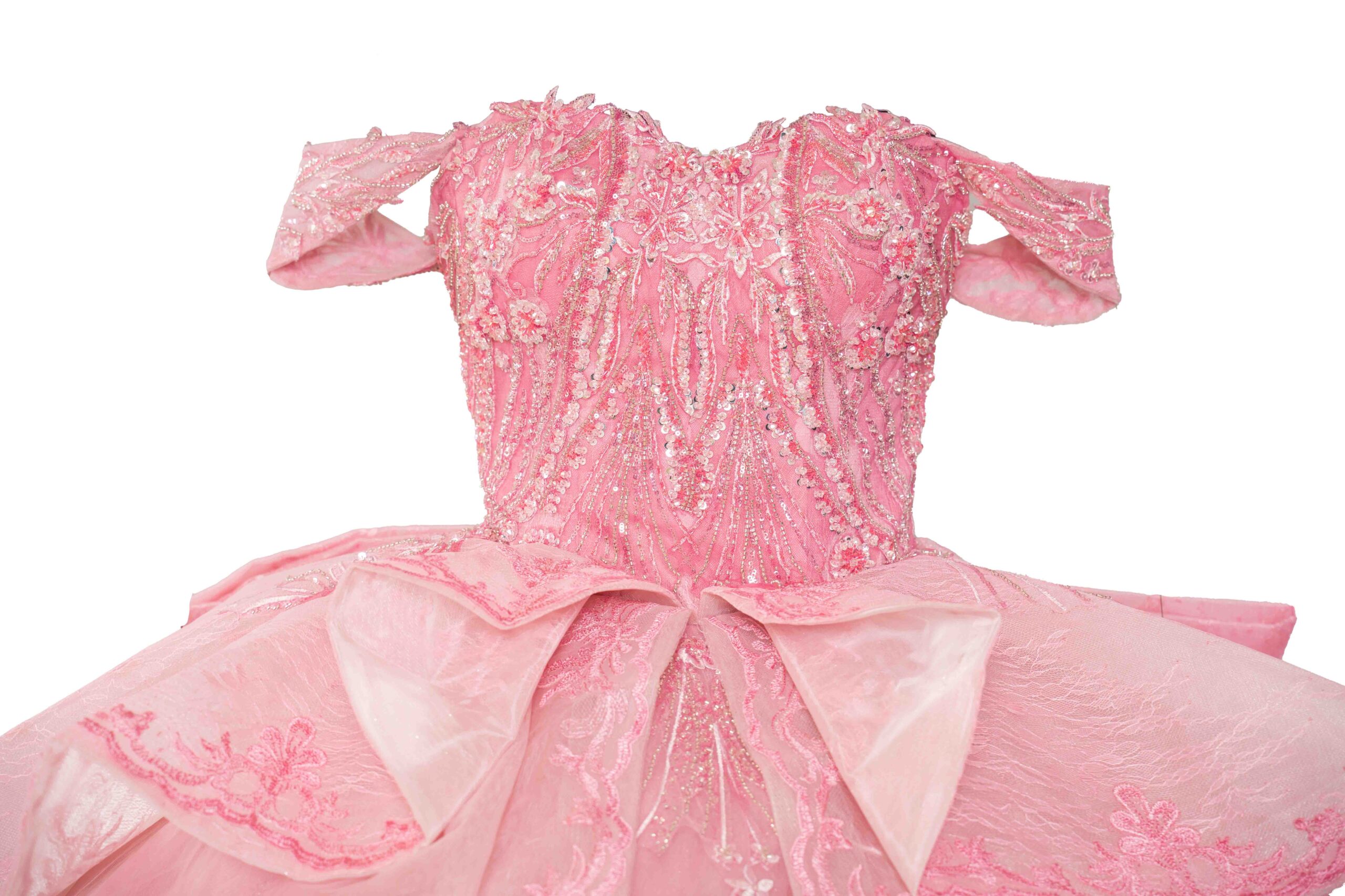 This exquisite pink dress is a masterpiece of feminine elegance, perfect for making a grand entrance at your Quinceañera. The bodice is intricately adorned with detailed embroidery, showcasing a delicate pattern that adds an element of sophistication. A graceful off-the-shoulder neckline accentuates the collarbone and shoulders, while the fitted waistline elegantly transitions into a voluminous skirt. Layers of luxurious tulle fabric cascade to the floor, each tier more enchanting with its ethereal floral embroidery. A large bow at the back adds a touch of whimsy, making this dress not just a piece of clothing but a work of art