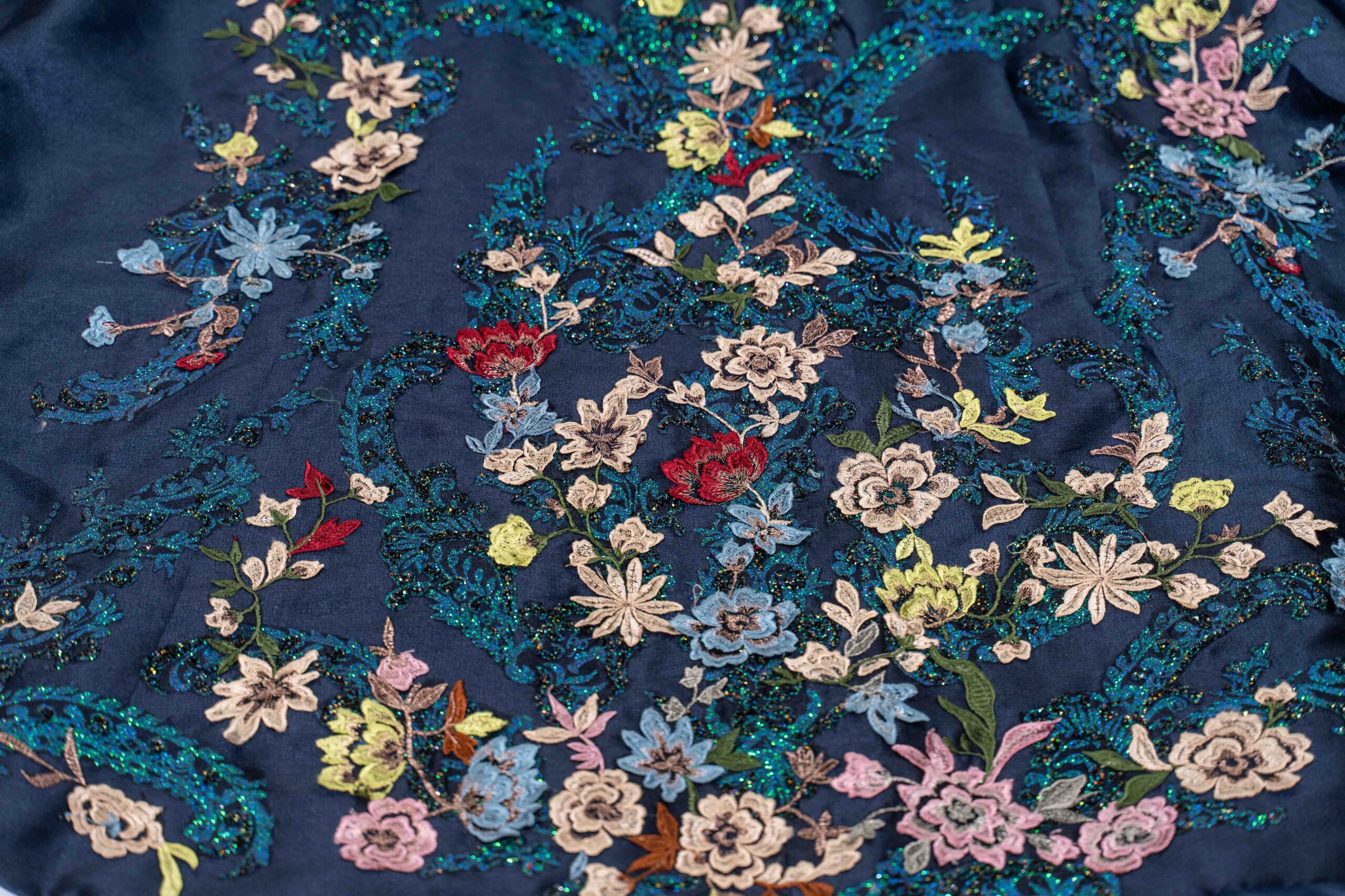 This luxurious dark blue Quinceañera dress features a voluminous skirt with multiple layers of ruffled fabric, creating an elegant and dramatic effect. It has an off-the-shoulder neckline adorned with detailed floral embroidery in various colors. The bodice is fitted, enhancing the elegance of the dress. The train is expansive and features the same colorful embroidery. The overall aesthetic of the dress exudes opulence and refinement.