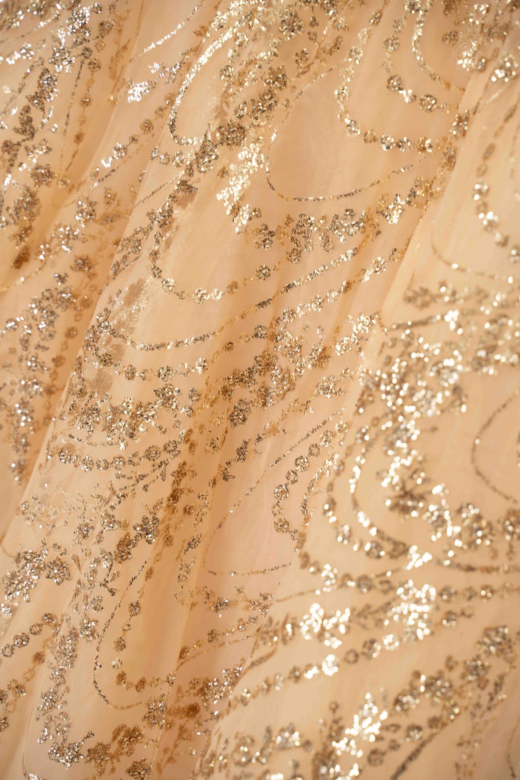 Make your Quinceañera even more special with this stunning champagne and gold dress. This dress is perfect for your grand Quinceañera entrance. The gown is intricately adorned with sparkling embellishments that cascade gracefully from the fitted bodice down to the voluminous skirt. The sleeve design, coupled with a v-neckline, accentuates the wearer’s form, offering a delicate balance of allure and modesty. A large bow train at the back adds a touch of whimsy. Every detail of this dress, from its radiant champagne hue to the meticulous detailing, promises an air of regality and charm.