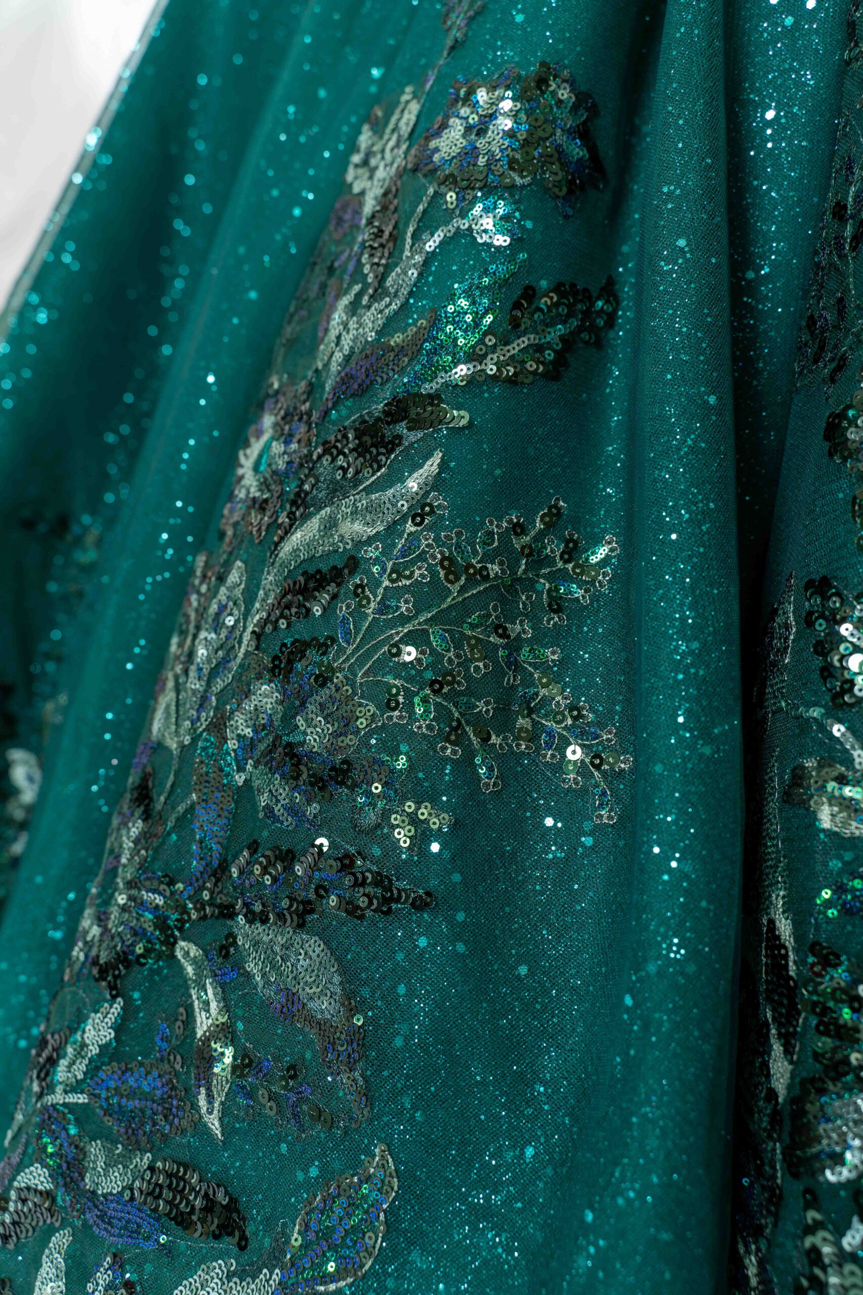 Crafted to captivate, this enchanting gown is a symphony of shimmering sequins and cascading tulle ruffles in a mesmerizing array of blue hues.